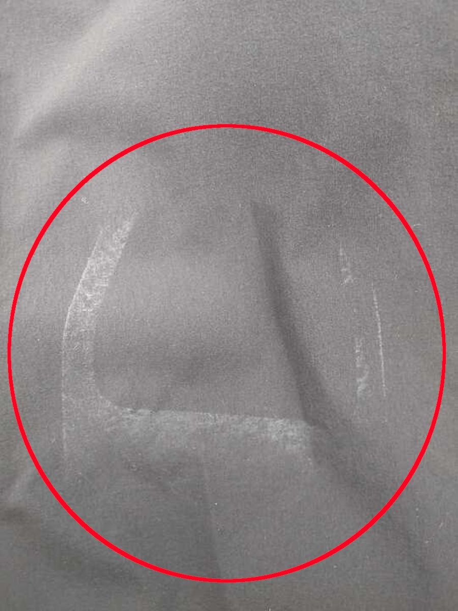 右足膝付近表面にアイロンで付いたと思われる跡がございます。