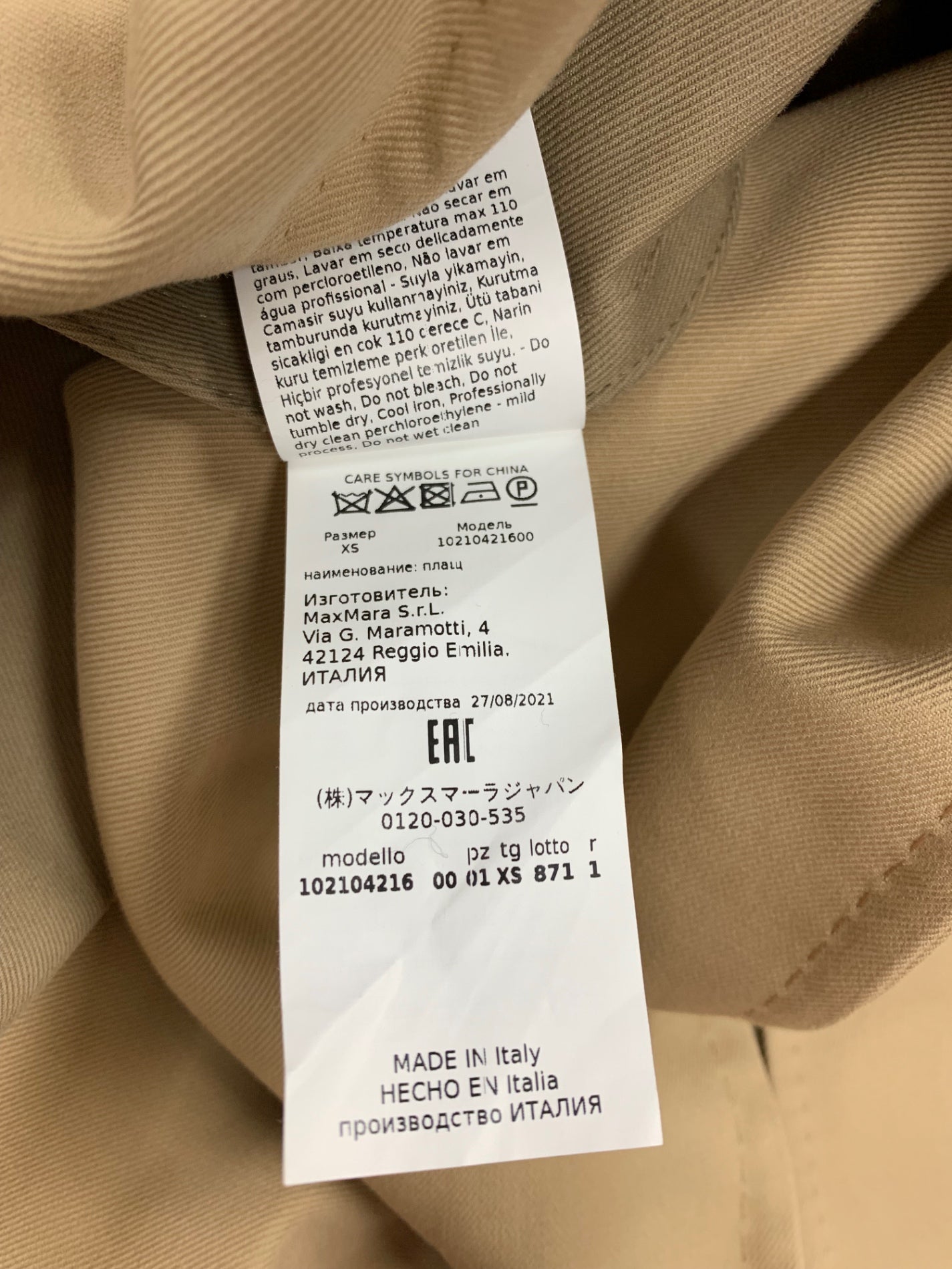 マックスマーラ 10210421600 ケープトレンチコート XS キャメル ITBV17OLGOXI